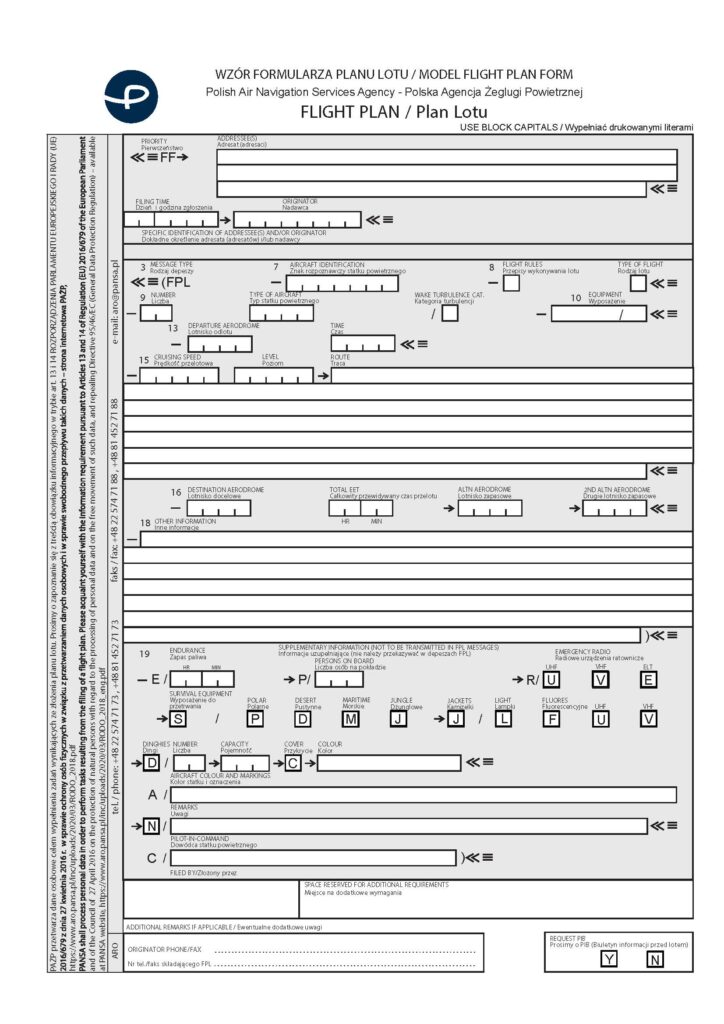 Aby ułatwić proces składania planu lotu dostępny jest druk formularza planu lotu zawierający skrócony zapis dotyczący obowiązku informacyjnego i dostępu do danych osobowych.